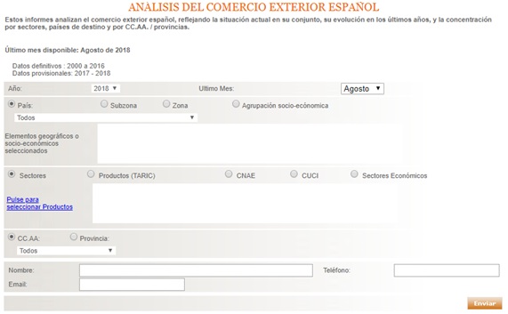 Otra herramienta que nos ofrece el ICEX, a partir de datos suministrados por la AEAT/ Departamento de Aduanas de la Agencia Tributaria de España, es el ESTACOM, que en tiempo real facilita estadísticas sobre el comercio exterior español. Podemos realizar la búsqueda en precio-valor, peso o unidades, por productos y sectores, por comunidades autónomas y provincias y meses o años que elijamos. Rellenando el formulario que mostramos a continuación, podemos acceder exactamente a aquellos parámetros que realmente necesitamos para nuestro estudio.