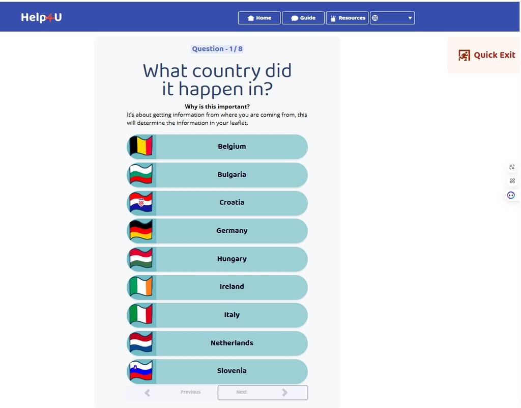 Help4U comenzó como un proyecto piloto entre Bélgica, Alemania, Irlanda, Países Bajos y Eslovenia, y desde entonces se ha ampliado para incluir también a Bulgaria, Chipre, Croacia, Grecia, Hungría, Italia, Portugal, España y Rumanía. Se espera que más países se unan en 2026 y en adelante.