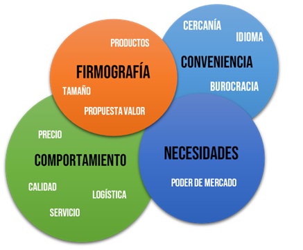 - Firmografía: se trata de establecer agrupaciones basados en rasgos más o menos evidentes de las empresas a las que te diriges en el mercado exterior; tamaño, tipos de productos complementarios o suplementarios que tienen en cartera, similitud o propuesta de valor de otros proveedores con la empresa, etc.