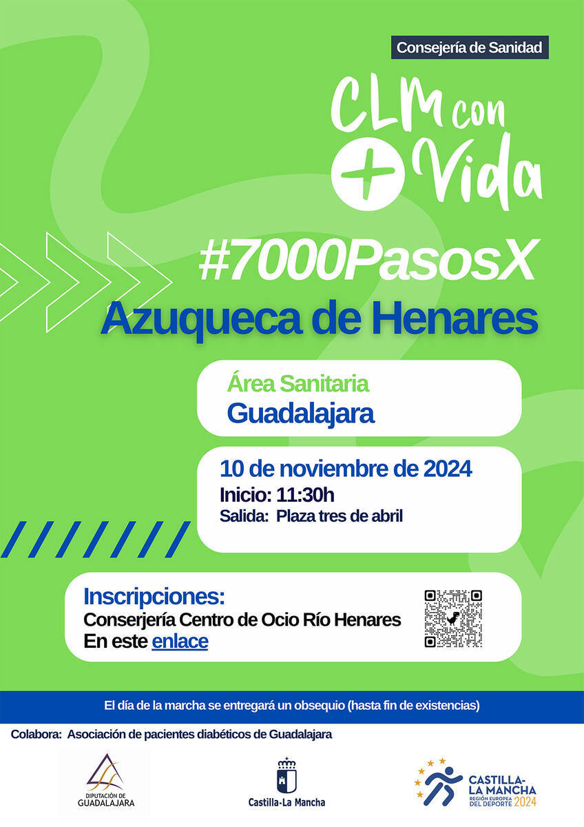 Para el domingo día 10 de noviembre, se ha programado en Azuqueca de Henares una edición de la Marcha 7000PasosX, una iniciativa de la Consejería de Sanidad de Castilla-La Mancha en colaboración con los ayuntamientos que tiene como objetivo fomentar el ejercicio físico y el ocio saludable entre la población.