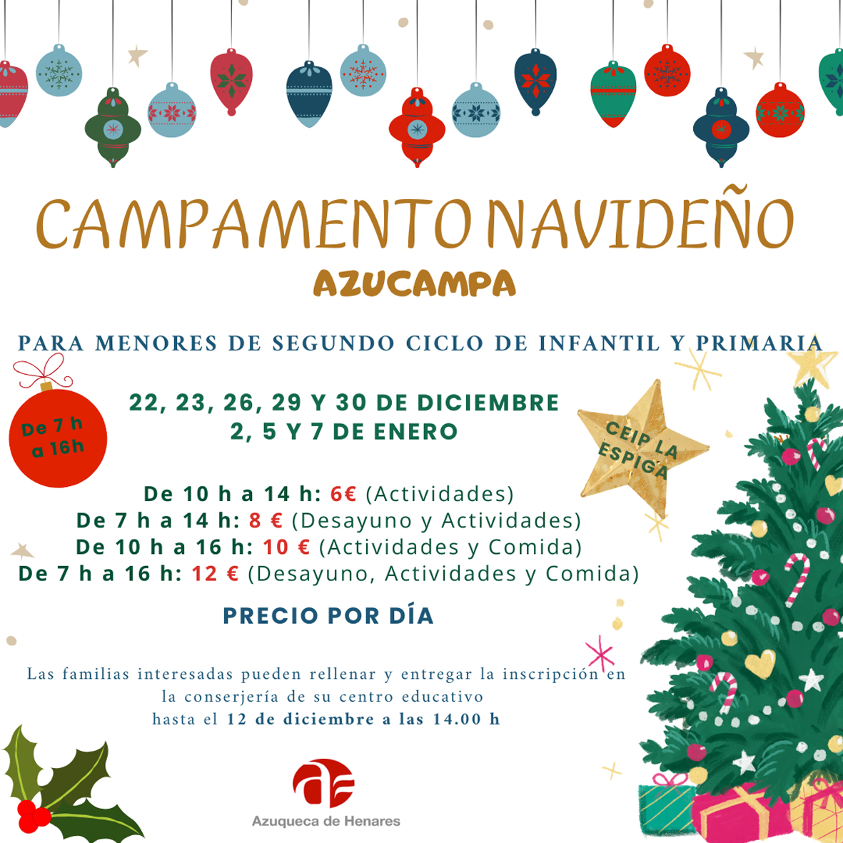 Abierta la inscripción en el campamento navideño del Ayuntamiento para alumnado de segundo ciclo de Infantil y Primaria Objetivo CLM El Ayuntamiento de Azuqueca de Henares organiza una nueva edición del programa municipal Azucampa. “Con motivo de las vacaciones escolares, los días 22, 23, 26, 29 y 30 de diciembre y el 2, 5 y 7 de enero, las instalaciones del CEIP La Espiga albergará un Campamento Navideño”, explica la concejala de Educación, Susana Santiago, quien recuerda que la actividad se dirige a menores de segundo ciclo de Infantil y de Primaria. “Para atender mejor las necesidades de cada familia, el servicio se presta en un horario amplio, entre las 7 y las 16 horas”, añade. En este sentido, los precios por día y franja horaria elegida son los siguientes: 6 euros, de 10 a 14 horas (actividades); 8 euros, de 7 a 14 horas (desayuno y actividades); 10 euros, de 10 a 16 horas (actividades y comida), y 12 euros, de 7 a 16 horas (desayuno, actividades y comida). Las hojas de inscripción están disponibles en las consejerías de los centros educativos (también se puede descargar pinchando AQUÍ), donde se deben entregar una vez rellenas. El plazo se cierra a las 14 horas del viernes 12 de diciembre. |
