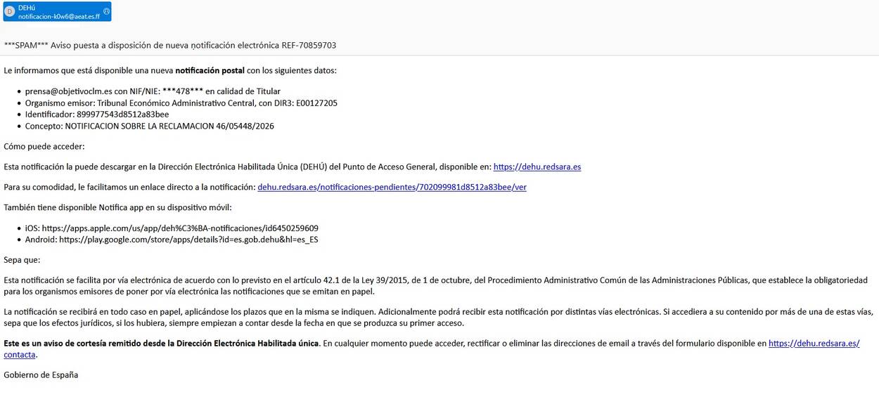El engaño comienza con un mensaje que informa sobre la "puesta a disposición de una notificación electrónica relacionada con una reclamación". El asunto puede variar, pero uno de los detectados es: "Aviso puesta a disposición de nueva notificación electrónica REF‑XXXXXXXX". A simple vista, el correo parece totalmente legítimo por su redacción y maquetación profesional, pero la trampa está en el remitente: no utiliza el dominio oficial "agenciatributaria.gob.es".