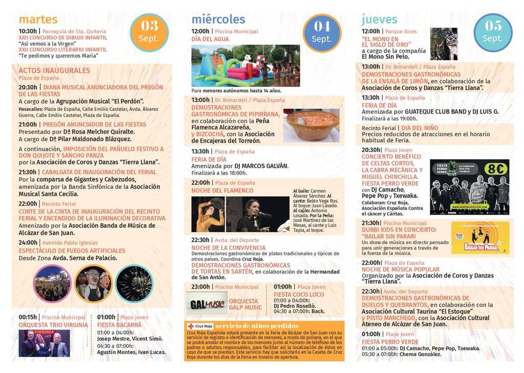El martes 3 de septiembre tendrá lugar el pregón inaugural, que tal y como manda la tradición, viene precedido de la diana anunciadora a cargo de la Agrupación Musical 'El Perdón', que partirá a las 20:30 de la Plaza de España. Más tarde, a las 21:00, la alcazareña archiconocida por su vinculación a la Asociación de Coros y Danzas de nuestra ciudad, Pilar Maldonado, será la encargada de dar el pregón frente a sus vecinos y vecinas. Posteriormente, los tradicionales Gigantes y Cabezudos liderarán el pasacalles que precede al corte de cinta inaugural por parte de la alcaldesa Rosa Melchor y el resto de representantes institucionales, culminando la velada con el disparo de un total de 301,87 kilos de pólvora, que llenarán de luz y color el cielo del Corazón de la Mancha.