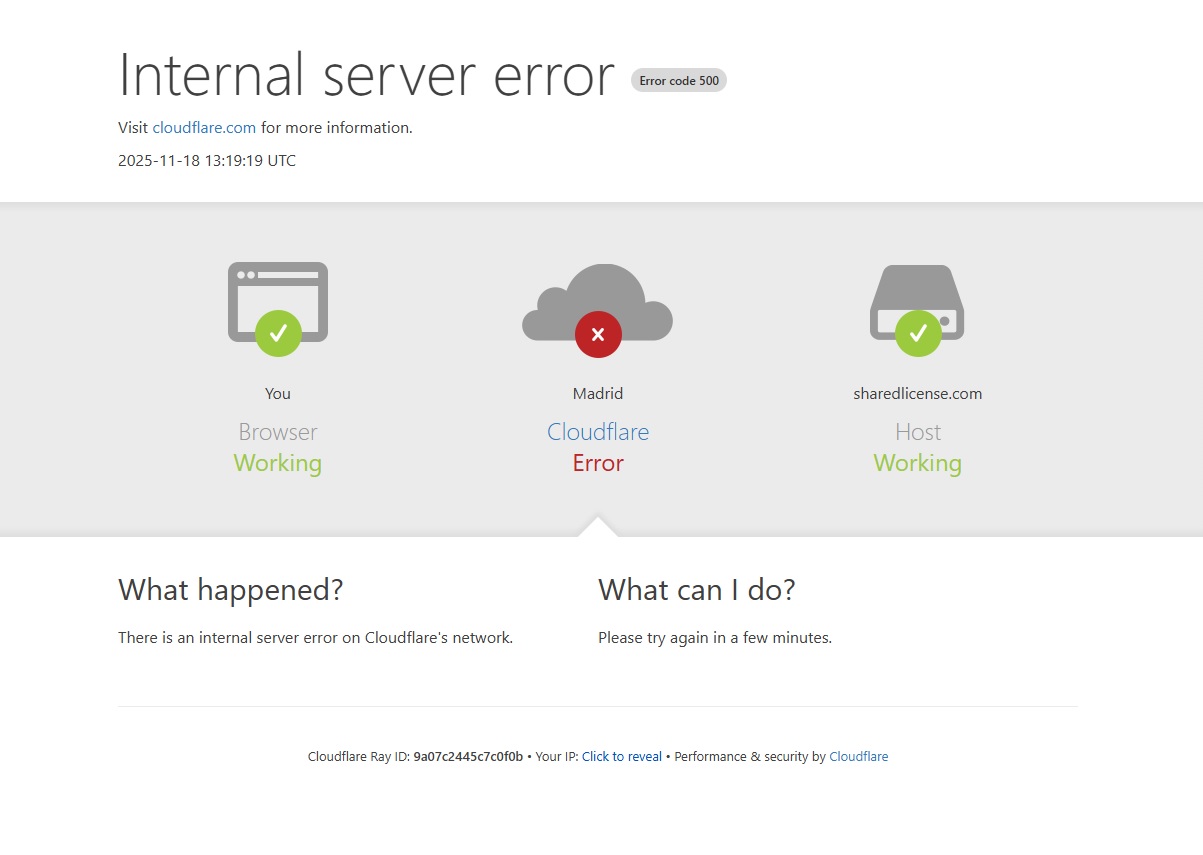 La red global de Cloudflare ha experimentado este martes 18 de noviembre de 2025 una interrupción masiva que ha degradado servicios en todo el mundo. El problema, que comenzó alrededor de las 11:48 UTC, provocó una cascada de fallos en plataformas populares como X (Twitter), ChatGPT de OpenAI, Spotify y Canva, entre muchas otras, ya que todo servicio que utilice esta red no funcionará mientras el servicio esté caído. Los usuarios están encontrando predominantemente con errores 500 y mensajes de "Internal server error" al intentar acceder a estos servicios.