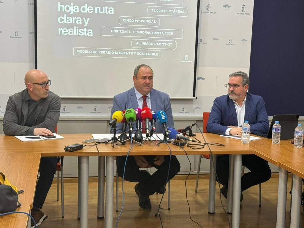 Castilla-La Mancha presenta el Plan Director Nuevos Regadíos, una estrategia clave para el sector agroalimentario y el medio rural>> En la Delegación de Agricultura en Albacete Objetivo CLM El Gobierno de Castilla-La Mancha ha presentado hoy el ‘Plan Director Regional de Nuevos Regadíos 2022–2030, Regadío CLM 3.0’, una estrategia “necesaria para el futuro que nace de la necesidad de modernizar e incrementar de forma ordenada la superficie de regadío, como palanca estratégica para el futuro del sector agroalimentario regional, la adaptación al cambio climático y el desarrollo rural sostenible”. El consejero de Agricultura, Ganadería y Desarrollo Rural, Julián Martínez Lizán, ha sido el encargado de presentar este Plan, acompañado por el director general de Desarrollo Rural, José Juan Fernández, y las delegadas y delegados provinciales de la Consejería, “en un momento clave, dado que es ahora cuando se van a iniciar los trabajos para la nueva planificación hidrológica”. En este contexto, el Plan de Regadíos será el punto de partida para defender el mantenimiento de las reservas de agua y de unas concesiones mínimas suficientes en las distintas demarcaciones para la próxima planificación, “objetivos de este Gobierno, ya que Castilla-La Mancha riega un 5,5 por ciento menos que la media nacional, pero, sin embargo, estamos diez puntos en eficiencia por encima”. El Plan se basa en tres objetivos estratégicos que son la sostenibilidad, para garantizar una gestión responsable del agua, la protección del medio natural y una agricultura rentable y de futuro; la lucha contra la despoblación, priorizando los regadíos sociales en zonas rurales vulnerables; y la tecnología y la eficiencia, aplicada tanto al uso del agua como a la mejora de la competitividad y los mercados. En cuanto a su articulación, establece “una hoja de ruta clara y realista” que contempla 18 proyectos de nuevos regadíos, con una superficie total de cerca de 25.000 hectáreas, distribuidas por las cinco provincias, y con un horizonte temporal hasta el año 2030. Por tanto “no hablamos de un plan teórico, sino práctico y pegado al territorio, ya que algunos proyectos ya están en ejecución y otros están planificados para los próximos años”. El Plan se alinea con la PAC 2023-2027, a través de su Plan Estratégico, y el FEADER, y se apoya también en otros instrumentos europeos vinculados a la resiliencia hídrica y la transición ecológica. A ello se suma el compromiso financiero de la Junta de Comunidades de Castilla-La Mancha y, en determinados proyectos, la participación del Estado cuando existe declaración de interés general o regional. Modelo eficiente, social y territorial El consejero de Agricultura, Ganadería y Desarrollo Rural ha explicado que, con este Plan, el Ejecutivo autonómico “apuesta por un modelo de regadío eficiente y sostenible”, actuando únicamente donde hay disponibilidad de agua y encaje en la planificación hidrológica, incorporando riego por goteo, bajas dotaciones, digitalización, riego deficitario controlado y un uso creciente de aguas regeneradas, reduciendo la presión sobre los acuíferos. Desde el punto de vista socioeconómico, el Plan apuesta de forma clara por el regadío social, estableciendo un mínimo de diez comuneros-socios por comunidad de regantes, una superficie máxima de 50 hectáreas por comunero, que no podrá superar en ningún caso el 25 por ciento de la superficie total de la zona regable, y demandando al menos un 40 por ciento de mujeres en las juntas rectoras para avanzar en igualdad, cohesión social y un reparto más equilibrado de los beneficios del regadío. Es decir, “es un Plan con una clara vocación social y territorial que apuesta de forma decidida por los regadíos sociales como herramienta para fijar población en el medio rural, limita la concentración de superficie, impulsa el relevo generacional y refuerza la participación de las mujeres en las comunidades de regantes”, ha declarado. Julián Martínez Lizán ha concluido esta presentación asegurando que, “Regadío Castilla-La Mancha 3.0 es una apuesta estratégica para producir más y mejor con menos agua, generar empleo, fijar población en el medio rural y reforzar la competitividad del sector agroalimentario con criterios de sostenibilidad”. |