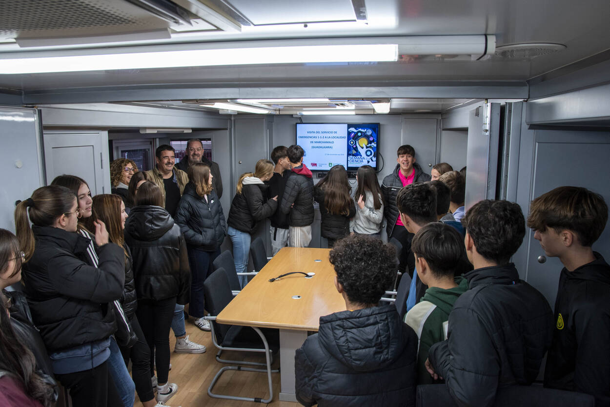 El camión de comunicaciones del Servicio de Emergencias 112 de Castilla-La Mancha ha visitado esta mañana Marchamalo como parte de las actividades de la III Semana de la Ciencia organizada en la localidad. Esta unidad, diseñada como centro de operaciones móvil, se activa en emergencias de Nivel 2 para garantizar la coordinación eficaz entre los distintos servicios.