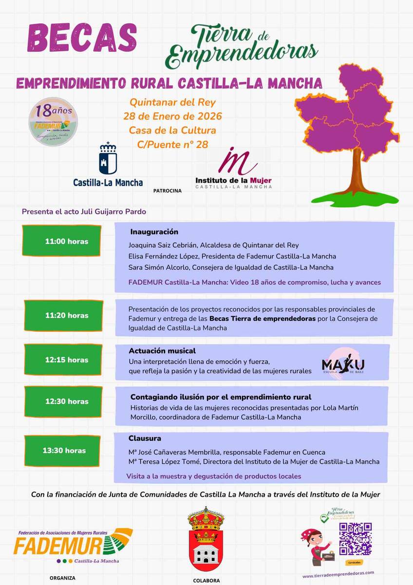 Cinco becas al emprendimiento y un reconocimiento especial a proyectos en el medio rural Objetivo CLM Reivindicar el talento emprendedor de las mujeres rurales de Castilla-La Mancha, sus proyectos, iniciativas e ideas es una de las bases de los reconocimientos y becas al emprendimiento rural en Castilla-La Mancha. Estas becas se entregarán mañana en la localidad conquense de Quintanar del Rey a partir de las 11:00 horas en la Casa de la Cultura. El acto contará con la participación de Sara Simón, consejera de Igualdad de Castilla-La Mancha, quien entregará personalmente las becas, junto a la alcaldesa Joaquina Saiz Cebrián y autoridades del Instituto de la Mujer regional. Tal y como explican desde Fademur, la Casa de la Cultura de la localidad conquense acogerá un encuentro que visibiliza la capacidad de innovación y el arraigo territorial de iniciativas lideradas por mujeres. En concreto, seis mujeres, una por cada provincia castellanomanchega, y un reconocimiento especial a un proyecto consolidado. Según Elisa Fernández, presidenta de Fademur, «cada una de estas emprendedoras representa un modelo de éxito basado en la innovación, la sostenibilidad y el compromiso con sus pueblos. Son la prueba viva de que el campo es sinónimo de oportunidades». En concreto, las Becas Tierra de Emprendedoras 2026 distinguen a: