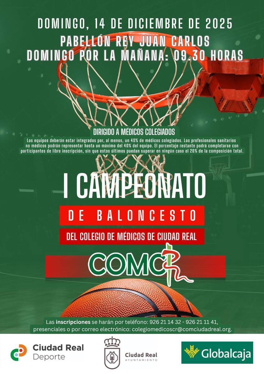 El Ayuntamiento de Ciudad Real y el Colegio de Médicos han presentado esta mañana en la sala de prensa municipal el I Campeonato de Baloncesto Colegio de Médicos, una iniciativa que busca fomentar la práctica deportiva como instrumento de bienestar y salud. El evento tendrá lugar el domingo 14 de diciembre de 2025 a las 9:30 horas en el Pabellón Rey Juan Carlos.
