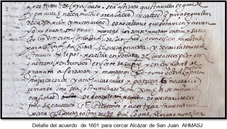 “En la villa de Alcazar a once días del mes de julio de mil e seiscientos e un años estando en la sala de ayuntamiento desta dicha villa juntos como lo tienen de costumbre los señores alcaldes y regidores que aquí firmaron sus nombres para proveer y platicar las cosas tocantes al bien publico desta villa, dijeron que en la ciudad de Toledo, Granada y Valladolid Corte de su Majestad y otras ciudades, villas y lugares del Reino, se guardan con mucho cuydado de muchas partes questan apestados, de cuya causa, sea acordado questa villa se guarde y por haber en ella muchos arrabales y calles que para se guardar de la dicha peste, como conviene, es necesario que se tapien y cierren y que no queden sino quatro puertas por donde puedan entrar y salir los que vinieren con las demás de las partes que no estén apestadas, para que con mas facilidad se pueda guardar. Y de causa de no tener esta villa propios, por estar empeñada, de causa de los pleitos que tienen pendientes en Corte de Su Majestad, y en la ciudad de Granada, acordaron y mandaron que se tome dinero prestado que para hacer la cerca y atajar las calles y portillos que es necesario cerrarse, como se acostumbrado a ataxar en semejantes ocasiones, de Juan Díaz Guerrero, depositario de los maravedís de la bellota, que entretanto que se trae facultad rreal para que se pueda gastar del dicho dinero lo que fueren e menester gastar en lo susodicho. Y nombraron a Francisco López del Quintanar, alguacil mayor, para que alquile obradas para traer tierras para hacer las dichas tapias y las haga hacer. Y ansi lo mandaron y firmaron”.