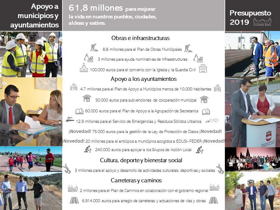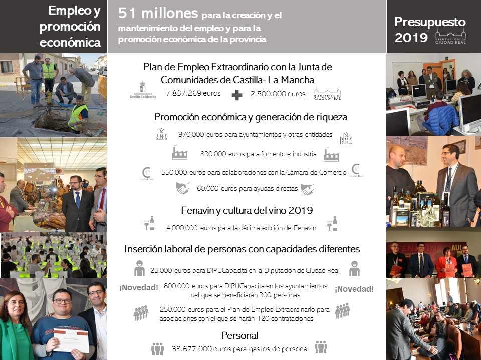 El presupuesto de la Diputación de Ciudad Real para 2019 es equilibrado, solidario, que tiene en cuenta las necesidades de los más vulnerables, pero también las posibilidades de progreso, promoción económica, modernización y desarrollo de la provincia, además de que ponen en evidencia la magnífica gestión económica que se ha realizado en los últimos cuatro años, período en el que desde la institución provincial se han atendido todas las necesidades generadas, se ha cumplido con la Ley de Estabilidad Presupuestaria y se ha pagado a los proveedores en un tiempo mínimo.