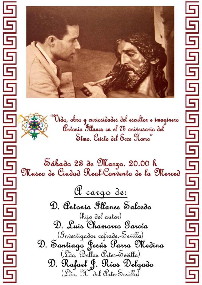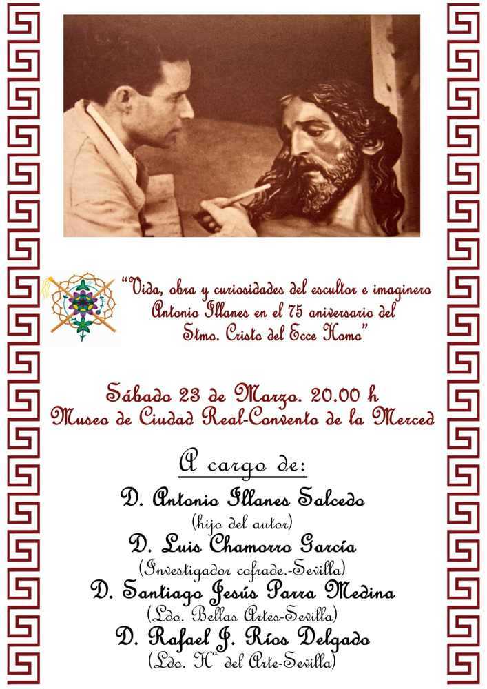 El próximo 23 de marzo, a partir de las 20 horas en el Museo de Ciudad Real-Convento de la Merced, la Hermandad Eccce Homo (Pilatos) de Ciudad Real ha organizado, con motivo de su 75 aniversario, una conferencia denominada “Vida, obra y curiosidades del escultor e imaginero Antonio Illanes”, con motivo del mencionado 75 aniversario del Santísimo Cristo del Ecce Homo.