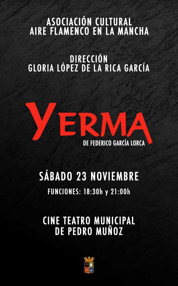 La Asociación "Aire Flamenco en la Mancha", de la localidad ciudadrealeña de Pedro Muñoz, pone en escena YERMA, la gran obra de Federico García Lorca, y que forma parte de la trilogía lorquiana, junto a BODAS DE SANGRE y LA CASA DE BERNARDA ALBA.