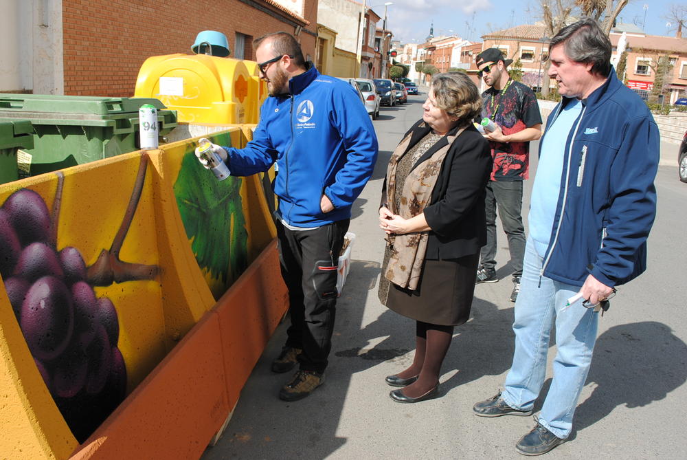 El Consistorio concluye la decoración de 63 isletas ecológicas en la vía públicaObjetivo CLM Los contenedores de Valdepeñas están escondidos a los ojos de los viandantes, que en lugar de toparse con ellos éstos han sido revestidos con un revestimiento de hormigón y que han sido decorados por el procedimiento de aerosoles con motivos de vegetación. Un proyecto que el Consistorio inició en 2005 con la primera fase con 34 isletas y 107 módulos y que ahora concluye su segunda fase con 29 isletas y 74 módulos decorados. La Concejala de Medio Ambiente y Agricultura, Amparo Crespo, ha recordado hoy que “lo que hemos pretendido es embellecer las calles, minimizar el impacto que dan los contenedores de orgánica y decorar nuestra ciudad, que es desde Medio Ambiente la principal motivación que tenemos”, agregando que “además de que los contenedores sirvan para reciclar, también estén visualmente lo mejor posible de cara a nuestros vecinos”. En total se han decorado 63 isletas y 180 módulos de hormigón, con una inversión de 22.000 euros, que vienen a ofrecer una imagen más amable y alejada de las pintadas y graffitis, ya que las pinturas son respetadas por los que comenten este tipo de vandalismo, según apuntó Crespo. El artista Marcos Tirado, junto a Guille Jimeno, han sido los encargados del proceso creativo y de la decoración de estas isletas. Tirado explicaba que “básicamente la técnica ha sido mediante aerosol, a modo de pintura mural, y se han utilizado dos modelos basados en vegetación tropical y otro con algo más tradicional como las uvas”.