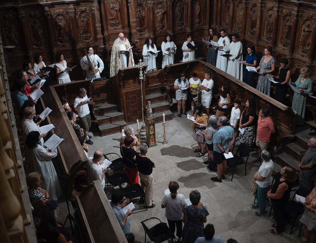 Cuenca revive la liturgia del siglo XII con una reconstrucción histórica de las II Vísperas de la Asunción en su catedral>> Mirabilia 2025 traslada a 800 años atrás con cantos originales, incienso y símbolos medievales en un acto multitudinario Objetivo CLM La Catedral de Cuenca ha acogido este 15 de agosto de 2025 una reconstrucción histórica de las II Vísperas de la Asunción de la Virgen María, tal como se celebraban en el siglo XII. El evento, organizado fuera del programa oficial de Mirabilia 2025, ha congregado a cientos de personas en un viaje multisensorial que combinó cantos gregorianos, incienso y símbolos litúrgicos medievales, según ha detallado la organización. Una ceremonia con rigor histórico La celebración, coincidiendo con el 829 aniversario de la consagración del templo (15 de agosto de 1196), comenzó con una procesión desde la girola hasta el coro capitular. Encabezada por el turiferario con un incensario humeante, continuó con la cruz procesional, velas, cantores vestidos con albas medievales y el sonido del órgano portativo de Cristina Alís. El Capellán Mayor de la Catedral, Miguel Ángel Albares, presidió el acto, que utilizó cantorales originales con partituras del siglo XII. Los asistentes, que abarrotaron el coro y las naves laterales, escucharon el Deus, in adjutórium meum inténde («Dios mío, ven en mi auxilio») entonado en latín, seguido de himnos, antífonas y salmos del canto llano. El momento culminante llegó con el Magnificat, cuando se incensó una imagen románica de la Virgen creada por el canónigo Anastasio Martínez Sáez, legada a la catedral. Detalles simbólicos y repercusión El acto incluyó gestos rituales, movimientos procesionales y el aroma del incienso, que «ascendió como las oraciones», según describieron los organizadores. Al finalizar, los cantores interpretaron el Noviscedunt vetera («Lo viejo da paso a lo nuevo») del Códice de las Huelgas, prolongando la ceremonia ante un público que ovacionó de pie. Mirabilia ha destacado que esta reconstrucción, a cargo de profesores y alumnos del curso de música medieval, buscaba «redescubrir la riqueza histórica del templo» y su vinculación con la festividad de la Asunción, central en el calendario litúrgico conquense desde el siglo XII. |