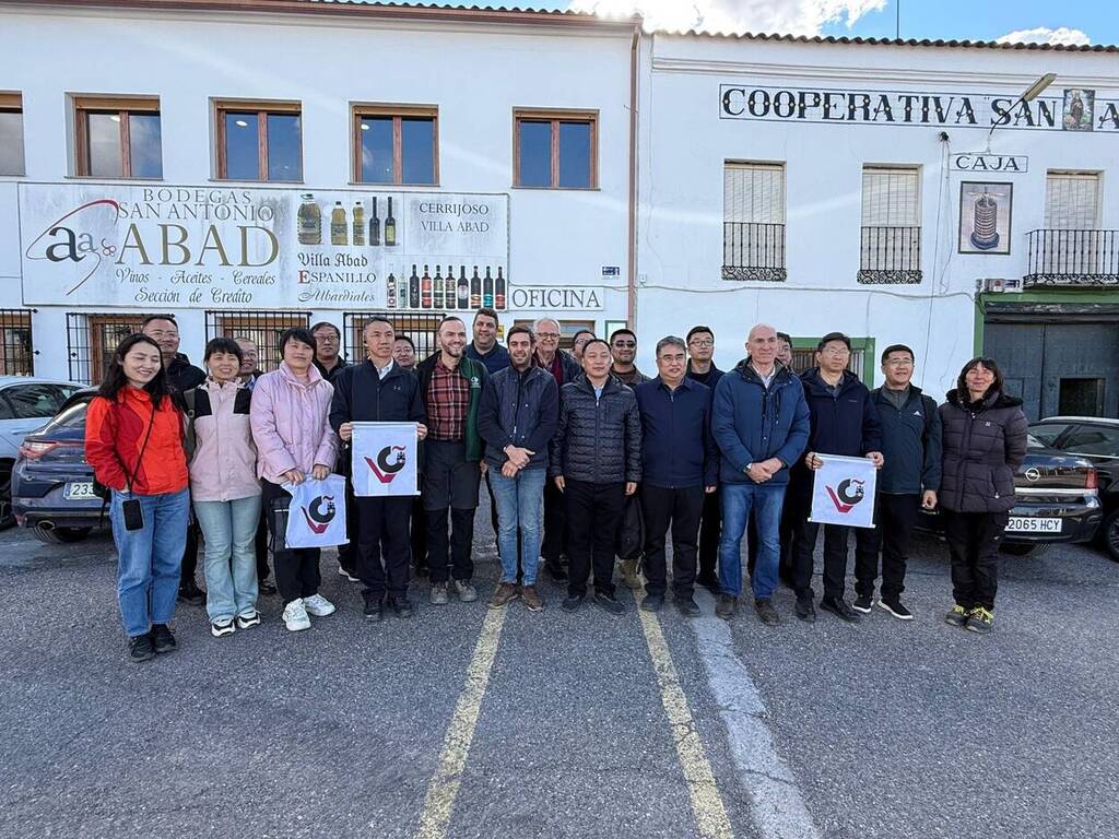 Tras el recorrido por la Laguna Larga, la comitiva se desplazó hasta la Cooperativa San Antonio Abad, donde fueron recibidos por su presidente, Joaquín Amador, y por varios agricultores locales. Allí pudieron conocer de primera mano el funcionamiento de la cooperativa y su relevancia en la economía del municipio, así como degustar productos típicos de la zona, entre ellos vinos, quesos y pistachos elaborados en Villacañas.