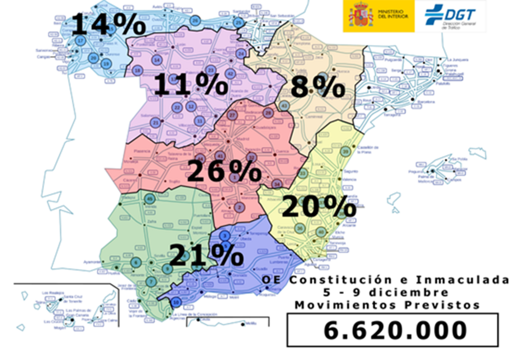 La DGT prevé 6,6 millones de desplazamientos durante el puente de la Constitución y la Inmaculada Objetivo CLM El jueves 5 de diciembre a las 15:00 horas arranca el dispositivo especial de regulación, ordenación y vigilancia del tráfico que la Dirección General de Tráfico (DGT) ha preparado con motivo del puente de la Constitución y que estará activo hasta la medianoche del lunes 9 de diciembre. Este año son seis las comunidades autónomas que trasladan la festividad de la Inmaculada, que cae en domingo, al lunes, prolongando así los días festivos. En concreto son las comunidades de Andalucía, Aragón, Asturias, Castilla y León, Extremadura y Murcia las que disfrutarán de cuatro días de descanso y ocio y muchos de los ciudadanos los aprovecharán para realizar desplazamientos por carretera. Según la DGT, durante estos días se producirán 6,6 millones de desplazamientos de largo recorrido por carretera, y que afectarán a las vías cuyo destino sean segundas residencias, zonas turísticas de descanso o ciudades con tradición navideña. Las previsiones de circulación elaboradas por Tráfico para estos días contemplan que los mayores incrementos de circulación se producirán tanto la tarde del jueves, especialmente entre las 16:00 y las 22:00 horas, como en la mañana del viernes 6. Este día, al ser festivo, también se producirán trayectos de corto recorrido a zonas de ocio y de esparcimiento cercanas a núcleos urbanos, produciéndose su retorno a primeras horas de la tarde. Una situación similar se producirá también el sábado. El domingo, los ciudadanos de las comunidades de Canarias, Cantabria, Castilla-La Mancha, Cataluña, Comunidad Valenciana, Galicia, Baleares, Madrid, Navarra, País Vasco y La Rioja regresarán del largo fin de semana, por lo que en las carreteras de acceso a las grandes ciudades incrementarán su intensidad, principalmente, desde las 15:00 horas y se alargará hasta la media noche. El lunes 9 de diciembre, el tráfico será el habitual en los movimientos de entrada y salida a las ciudades, en el caso de las comunidades donde este día es laborable. En cambio, en las comunidades en las que es festivo se producirá el retorno a las residencias habituales, pudiéndose generar problemas de circulación en las entradas de los grandes núcleos urbanos. Por todo esto, la DGT recomienda, como siempre, tener prudencia, respetar la normativa de tráfico, planificar los viajes con antelación y, si es posible, evitar las horas más desfavorables. En todo caso, la DGT dispone a través de su página web, el teléfono informativo 011 y Servicio de Información de Tráfico, de una información actualizada de la situación del tráfico en las carreteras a disposición de los conductores. Además, hay que tener en cuenta que, en la última parte de la Operación Especial tiene previsto celebrarse en la ciudad de Sevilla la procesión Magna, que concentrará un importante número de desplazamientos desde diferentes pueblos de Sevilla, así como de otras provincias de Andalucía hasta la ciudad de Sevilla durante los días 7 (tarde) y especialmente 8 de diciembre, con especial afección prevista en la carretera SE-30 y principales vías de acceso a la capital. Se recomienda que, antes de iniciar el desplazamiento, los conductores se informen sobre el estado de las vías y utilicen preferentemente el transporte público en sus accesos. Al servicio del conductor Para dar cobertura a esta operación y hacer que todos los movimientos previstos sean seguros, Tráfico ha establecido una serie de medidas de regulación, ordenación y vigilancia del tráfico para las que cuenta con la máxima disponibilidad, tanto de sus medios humanos (agentes de la Agrupación de Tráfico de la Guardia Civil, personal de los ocho Centros de Gestión de Tráfico de la DGT y personal encargado del mantenimiento de equipos y de la instalación de medidas en carretera, además del personal de los servicios de emergencias), como de sus medios técnicos (radares fijos y móviles de control de velocidad, además de helicópteros, drones, cámaras) para controlar el respeto a las normas de tráfico. Además, con el fin de favorecer la circulación en las zonas más conflictivas, se instalarán carriles reversibles y adicionales mediante señalización, balizamiento y conos en las horas de mayor afluencia circulatoria y se establecerán itinerarios alternativos. Asimismo, se paralizarán las obras en las carreteras, se limitará la celebración de pruebas deportivas y otros eventos que supongan la ocupación de la calzada y se restringirá la circulación de camiones de mercancías en general y a los que transportan determinadas mercancías en ciertos tramos, fechas y horas. El dispositivo establecido se puede consultar en la web de la DGT. Consejos de conducción Estos días de puente es posible que la conducción deba llevarse a cabo bajo condiciones meteorológicas adversas, como son la nieve, el hielo, la niebla, la lluvia y el viento. Conducir así, no sólo aumenta la tensión nerviosa y la fatiga visual que conlleva una disminución de la atención, sino que también se alteran de forma significativa las condiciones en las que se desarrolla la circulación, a la vez que se generan mayores dificultades a las previstas en el viaje por carretera. La DGT a través de la revista Tráfico y Seguridad Vial ha elaborado un especial de Conducción en Invierno que puede consultarse en la web del organismo. Como todos estos inconvenientes se pueden presentar de manera inesperada en cualquier momento del viaje, es importante tener siempre presentes las dos reglas básicas para la conducción, como son la prevención y la prudencia, que nos permitirán realizar el viaje por carretera en las mejores condiciones de seguridad vial. Recomendaciones básicas de la DGT Antes de emprender el viaje, poner a punto el coche con una revisión que garantice que todos los elementos resisten las condicion