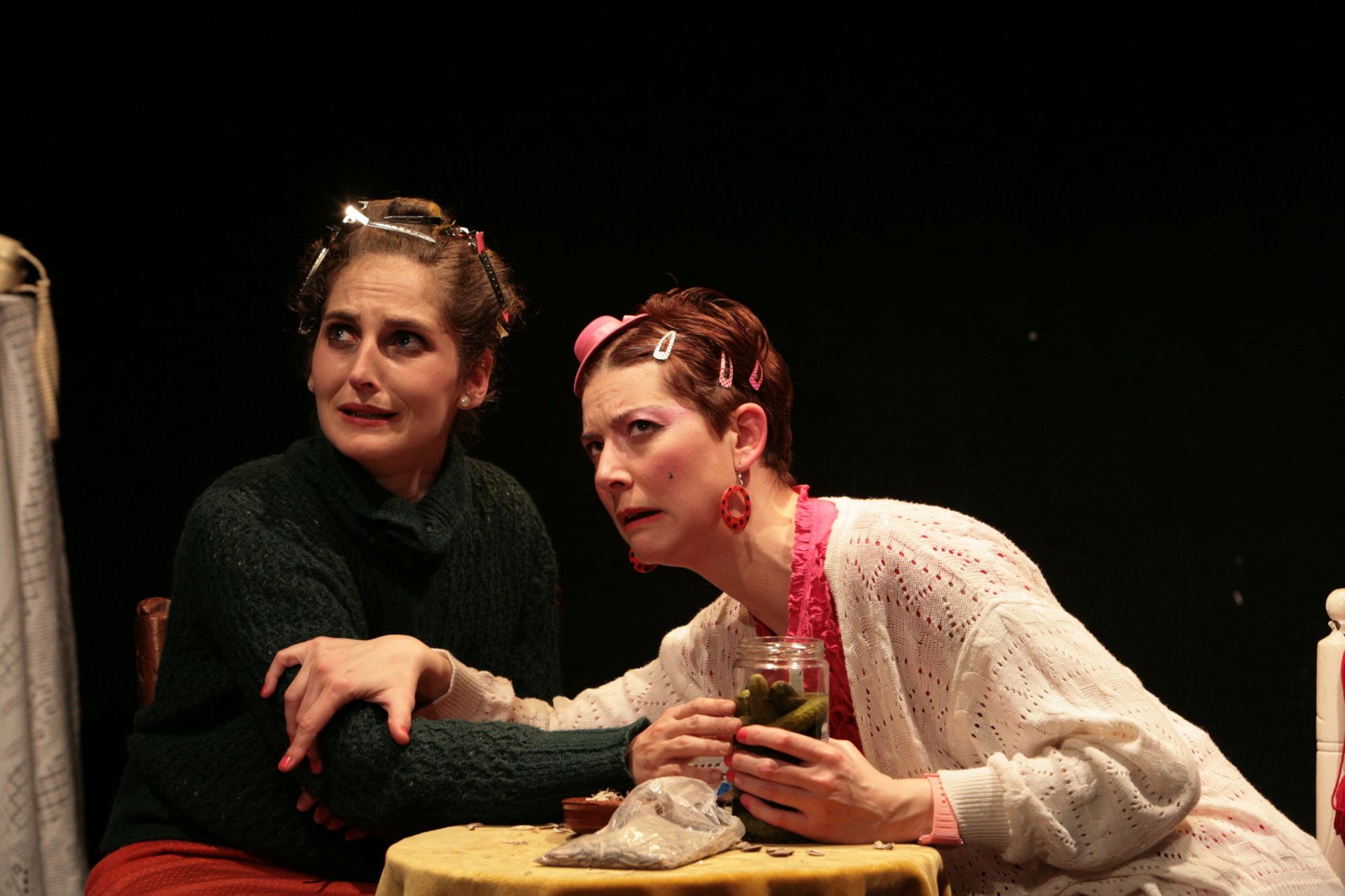 Sin salir de su saloncito abordan durante toda la pieza un elaborado juego oral acompañado por el cuerpo, el alma y la emoción del clown y en ocasiones por qué no también del bufón, por su lado grotesco y satírico, creando de esta forma un cotidiano un tanto particular y tragicómico, vinculado al Teatro del Absurdo.