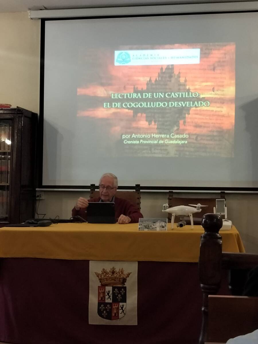 El cronista provincial Antonio Herrera Casado, miembro de la Academia, ofreció una completa exposición titulada "Lectura de un castillo: el de Cogolludo, desvelado", en la que recorrió la evolución del edificio desde su origen árabe en el siglo IX hasta su destrucción en 1811 por las tropas napoleónicas del general francés Hugo, padre del novelista Victor Hugo. Herrera recordó que el castillo fue "una pieza clave en la configuración de la villa" y destacó que aún se conserva la singular torre cuadrada con bóveda de casquete, que según algunos autores se denominaba "Torre de la Campana" por derivar del minarete de un Ribat árabe.