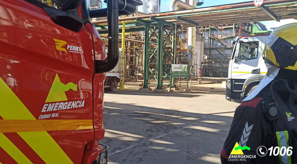 En el operativo trabajan bomberos de la propia planta de Fertiberia y de Puertollano, junto con efectivos de la Guardia Civil, Policía Nacional y Policía Local.