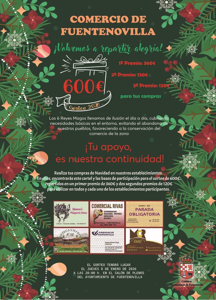 El Ayuntamiento de Fuentenovilla ha convocado el tradicional concurso de los Reyes Magos para 2026, con el objetivo de fomentar las compras navideñas en los establecimientos del municipio y visibilizar el papel imprescindible que desempeñan los pequeños negocios del medio rural. El sorteo, dotado con 600 euros en premios, se desarrolla en colaboración con los comercios locales.