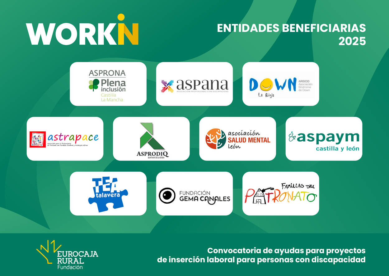 La Fundación Eurocaja Rural ha seleccionado las diez entidades beneficiarias de sus ayudas 'WORKIN' dirigidas a impulsar la inserción laboral de personas con discapacidad. Cada uno de los proyectos recibirá una ayuda de 10.000 euros, sumando un total de 100.000 euros en esta convocatoria cuyo objetivo es promover la capacitación profesional, la autonomía personal y la integración en entornos laborales inclusivos.