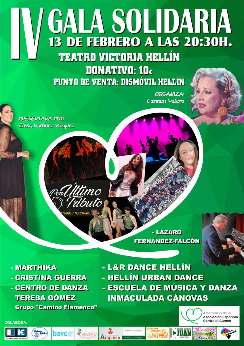La gala, organizada por la cantante Carmen Valero y conducida por la comunicadora de TV Hellín, Elena Martínez, ofrecerá una variada muestra artística con participantes como Marthika, Cristina Guerra, el Grupo Flamenco del Centro de Danza Teresa Gómez, L&R Dance Hellín, Hellín Urban Dance, la Escuela de Música y Danza Inmaculada Cánovas y el pianista Lázaro Fernández-Falcón, quienes compartirán escenario con El Penúltimo Tributo.