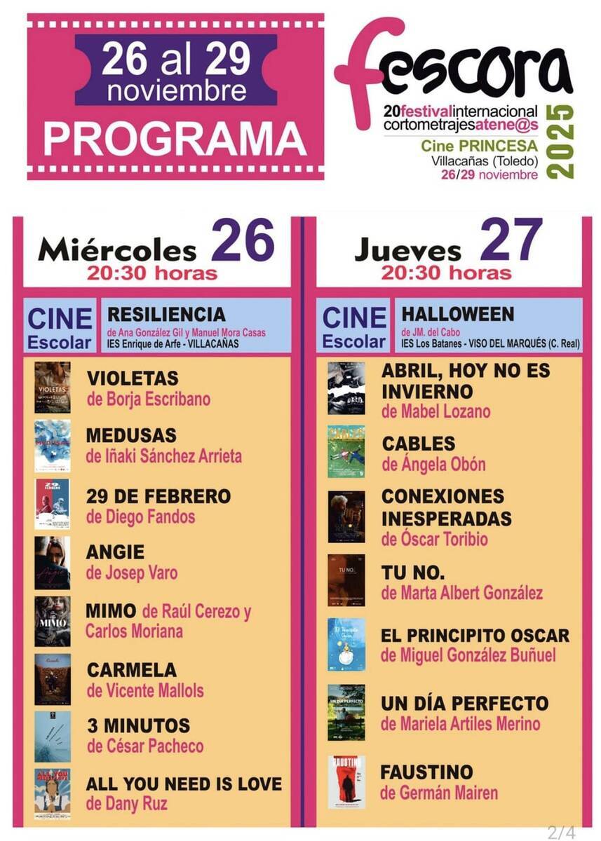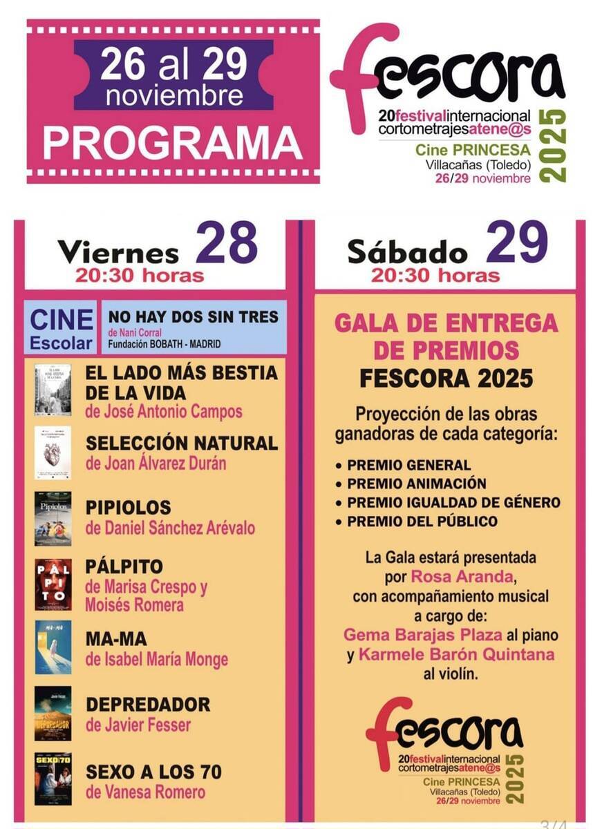 Noviembre vuelve a ser el mes del cine en Villacañas, gracias a la celebración de FESCORA, el Festival Internacional de Cortometrajes Atene@s que este año alcanza su 20ª edición.