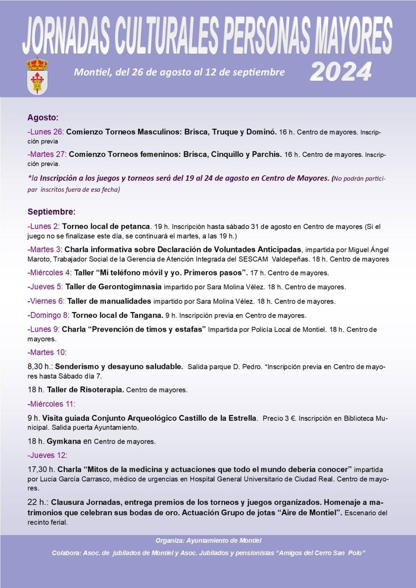 El municipio de Montiel (Ciudad Real) celebrará del 26 de agosto al 12 de septiembre una nueva edición de las Jornadas Culturales para Personas Mayores, organizadas por el Ayuntamiento de la localidad, con la colaboración de la Asociación de Jubilados de Montiel y la Asociación de Jubilados y Pensionistas “Amigos del Cerro San Polo”.