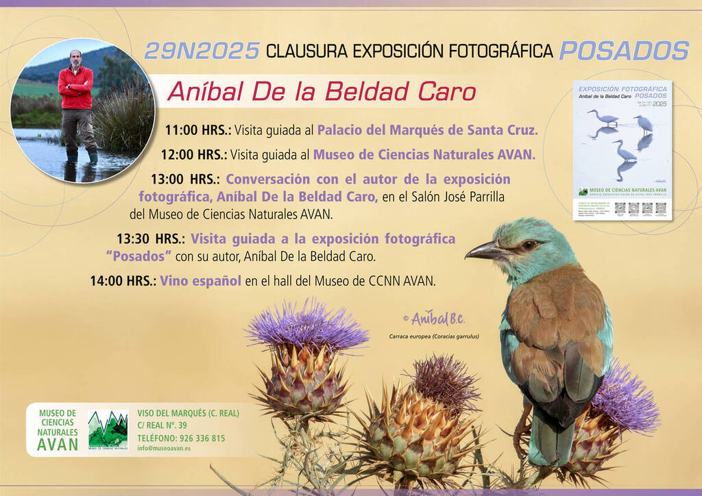 El Museo de Ciencias Naturales AVAN de Viso del Marqués (Ciudad Real) celebrará el próximo sábado 29 de noviembre los actos de clausura de la exposición fotográfica “Posados”, una muestra centrada en aves y en los ecosistemas que habitan, obra del fotógrafo de naturaleza Aníbal De la Beldad Caro.