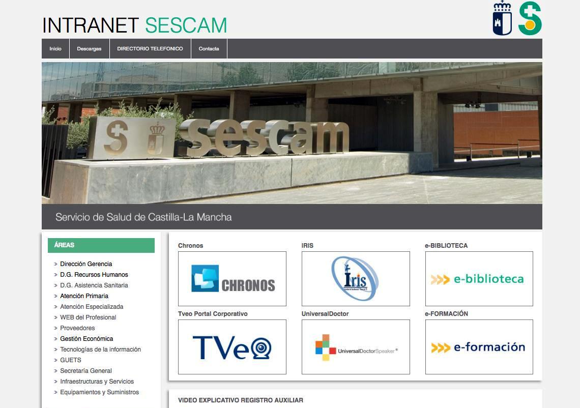 Cuenta con accesos a todos los sistemas de uso frecuente, como eBiblioteca, eFormación, Portal Corporativo de Videoconferencia TVeo, Sistema de gestión de Incidencias del SESCAM (IRIS), o Web del Profesional entre otros, integrando herramientas ‘on line’ alojadas en la página web del servicio regional de salud.