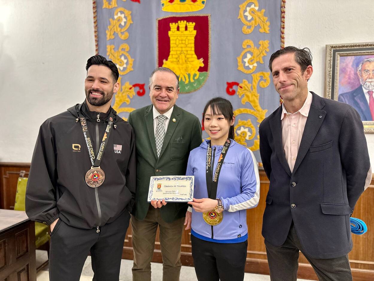 El alcalde de Talavera, José Julián Gregorio, acompañado por el concejal de Deportes, Antonio Núñez, ha recibido en el Ayuntamiento a los karatekas internacionales Grace Lau Mo Sheung y Ariel Torres Gutiérrez, tras sus "brillantes" resultados en el Campeonato del Mundo de Karate en modalidad individual, celebrado recientemente en El Cairo (Egipto), y que han vuelto a la ciudad para continuar con su preparación de cara a las próximas citas internacionales del circuito mundial.
