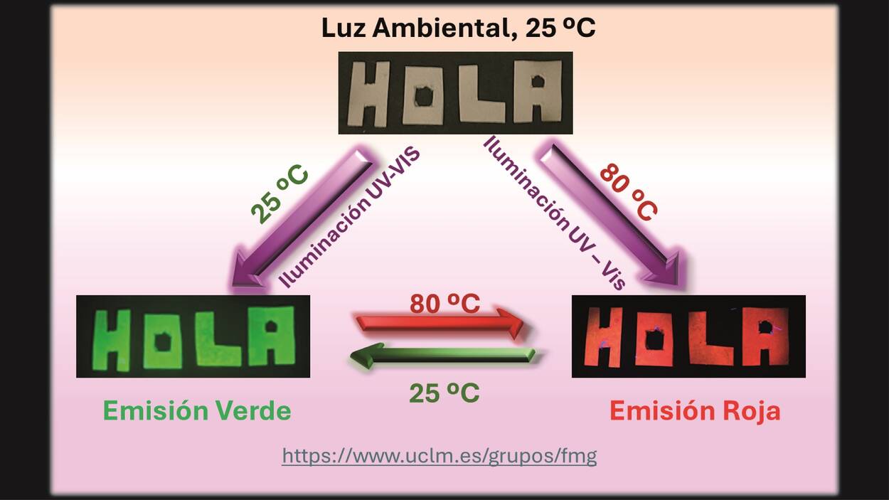 La UCLM desarrolla un nuevo material luminiscente con posibles aplicaciones en seguridad, control ambiental y optoelectrónica>> Avance del Grupo de Femtociencia y Microscopía bajo la dirección del profesor Abderrazzak Douhal Alaui Objetivo CLM Los resultados de este trabajo se han publicado en la revista científica internacional Journal of Materials Chemistry C, de la Royal Society of Chemistry. La investigación forma parte de la tesis doctoral de Francisco Sánchez Martínez y ha contado con financiación del Ministerio de Ciencia, Innovación y Universidades, la Unión Europea, la Junta de Comunidades de Castilla-La Mancha y la propia UCLM. Las perovskitas son materiales con una estructura cristalina que combina componentes orgánicos e inorgánicos. Esta configuración les permite presentar propiedades ópticas y electrónicas ajustables, lo que las hace muy atractivas para la investigación en energía, sensores y dispositivos emisores de luz, entre otras aplicaciones. Muchas perovskitas contienen plomo, un elemento tóxico y no deseable en el medio ambiente. El nuevo material desarrollado en la UCLM sustituye el plomo por manganeso, lo que reduce su impacto ambiental y abre nuevas posibilidades de uso seguro. El equipo ha sintetizado y caracterizado este compuesto tanto en forma de cristales individuales como en polvo y ha estudiado su comportamiento fotónico mediante técnicas avanzadas. Uno de los aspectos más destacados es su capacidad para cambiar de color de manera reversible en función de la temperatura. “Cuando varía la disposición electrónica del átomo de manganeso, la luz emitida pasa de verde a roja y vuelve a verde al enfriar, manteniendo su estabilidad durante muchos ciclos”, explica el profesor Douhal. Esta propiedad, denominada termofotocromismo, permite plantear sistemas de cifrado y descifrado de doble clave basados en cambios de color de emisión controlados por temperatura. Además de su posible uso en seguridad de datos, el material puede detectar vapores de disolventes comunes, lo que lo convierte en una herramienta prometedora para el control ambiental y la seguridad industrial. Los investigadores también han demostrado que puede emplearse en la fabricación de diodos emisores de luz (LED) de color verde con baja conversión energética, una característica clave para el desarrollo de dispositivos electrónicos más eficientes y sostenibles. |